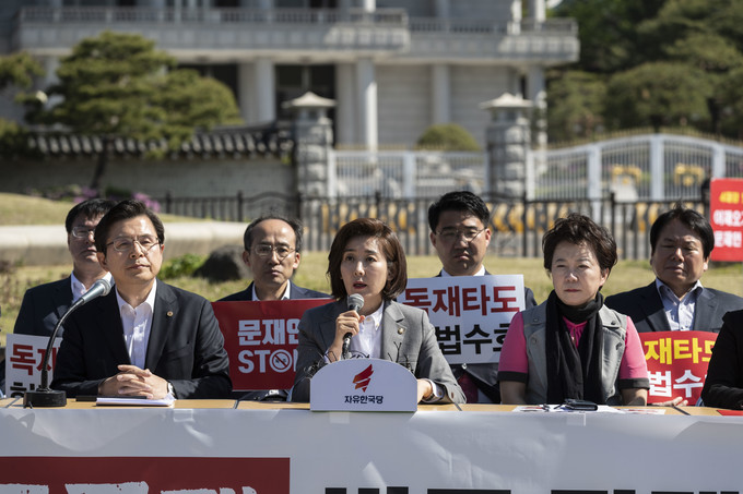 나경원 자유한국당 원내대표가 2일 오전 서울 청와대 앞 분수대 광장에서 열린 자유한국당 최고위원회의에서 발언 하고 있다.