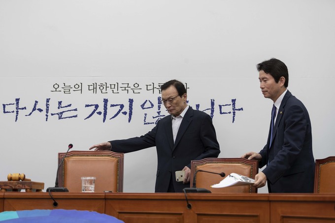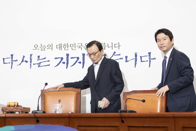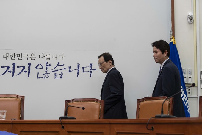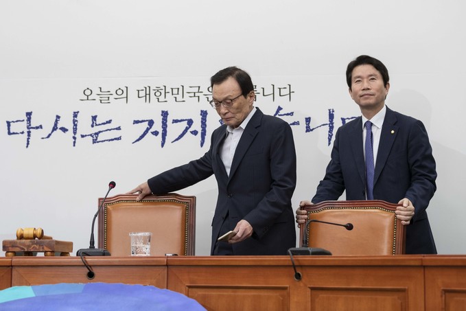 더불어민주당 이해찬 대표(왼쪽)와 이인영 원내대표가 23일 오전 서울 여의도 국회에서 열린 민주당 최고위원회의에 참석하고 있다.