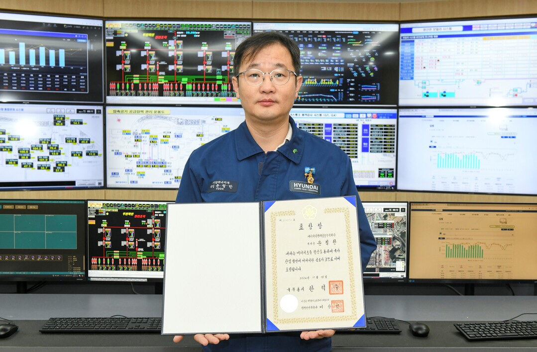 HD현대삼호 윤철한 책임매니저가 대한민국 에너지 효율 향상과 재생에너지 산업발전에 기여한 공로를 인정받아 국무총리 표창을 수상했다.