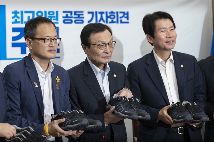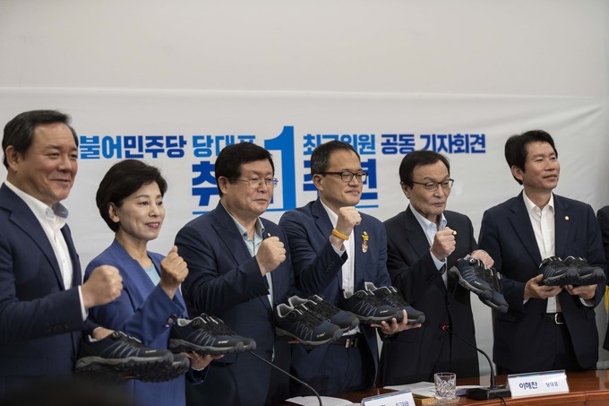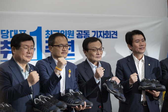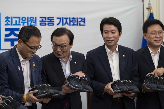 더불어민주당 이해찬 대표(왼쪽 다번째), 이인영 원내대표(왼쪽 여섯번째) 등 당 지도부가 23일 오전 서울 여의도 국회에서 열린 민주당 당대표, 최고위원 취임1주년 공동 기자회견 중 운동화를 들고 기념사진을 찍고 있다.