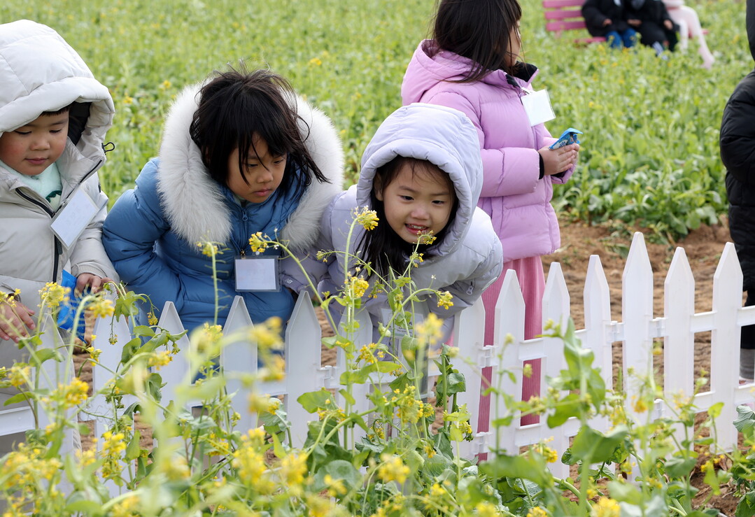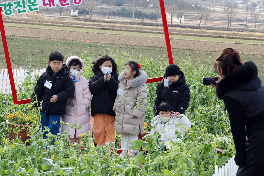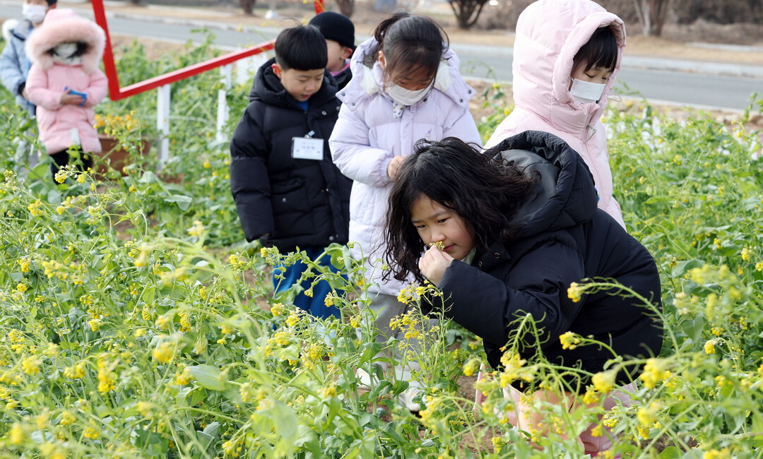 | ▲ 지난 24일 제53회 강진청자축제가 열리는 대구면 청자박물관 인근에서 축제장을 찾은 어린이들이 남문 입구에 활짝 핀 유채꽃 향기를 맡고 있다. [강진군 제공] |