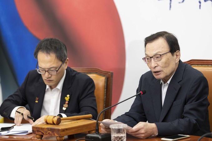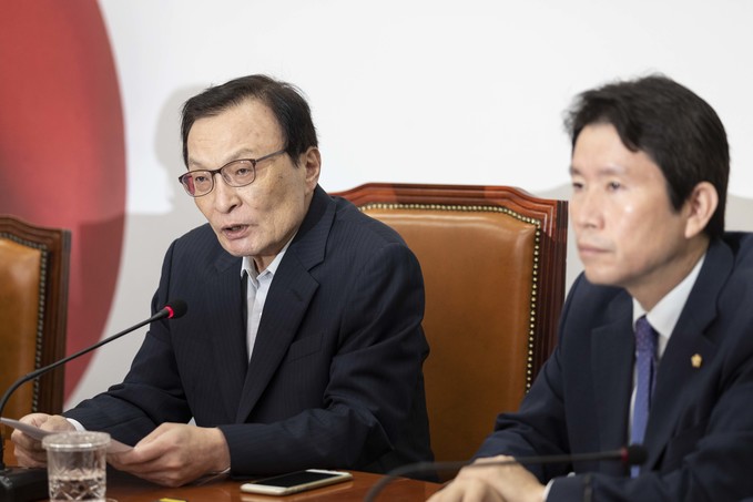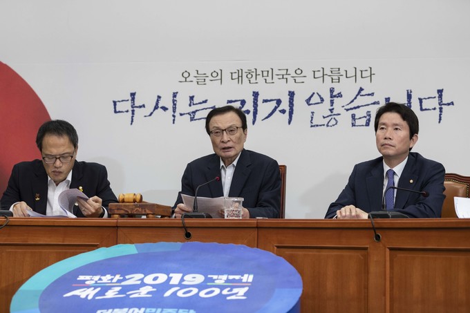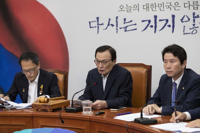 더불어민주당 이해찬 대표(가운데)가 23일 오전 서울 여의도 국회에서 열린 민주당 최고위원회의에 참석해 발언하고 있다.