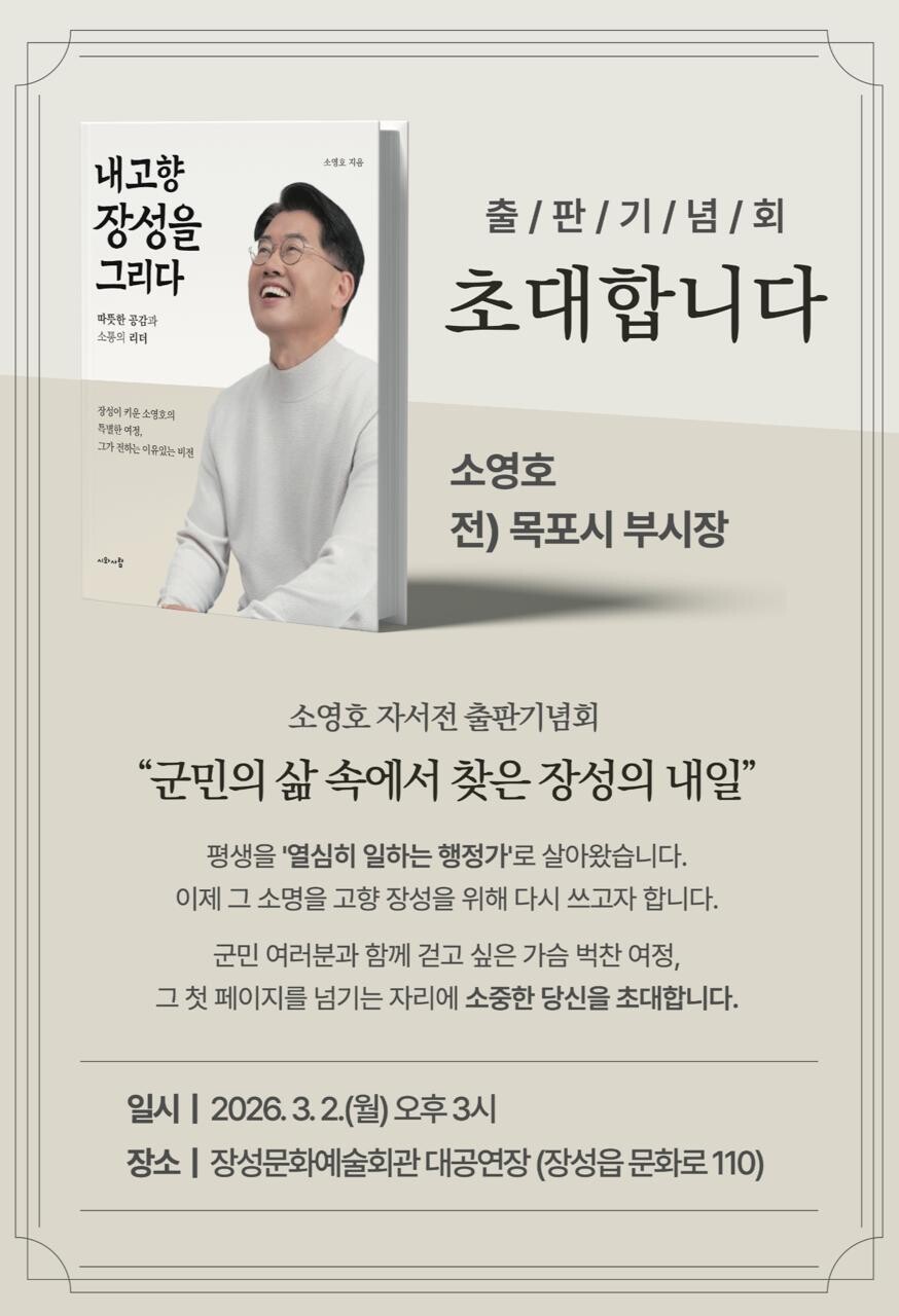 소영호 전 전남도 전략산업국장이 자신의 삶과 철학, 장성의 미래 구상을 담은 자서전 '내 고향 장성을 그리다'를 내고 다음 달 2일 장성문화예술회관에서 출판기념회를 개최한다고 26일 밝혔다.