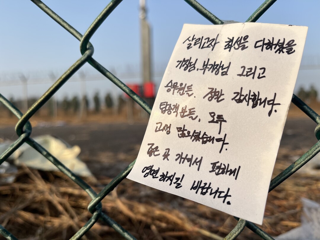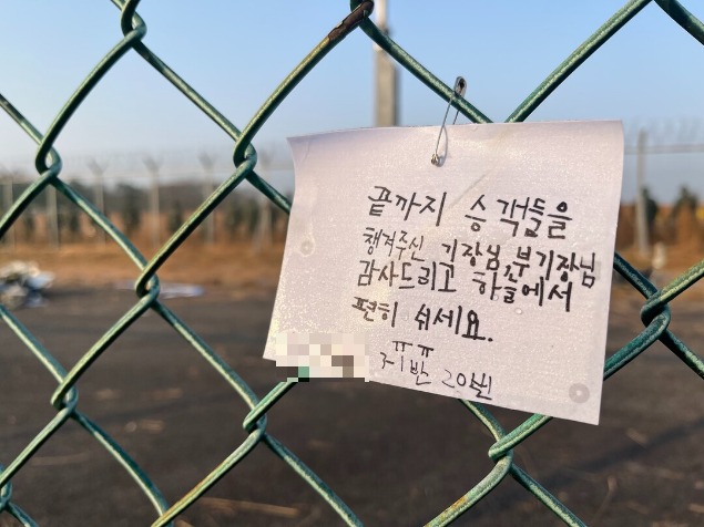 | ▲ 2일 제주항공 여객기 참사 현장에 기장과 부기장을 추모하는 메모지가 적혀 있다. [강성명 기자] |