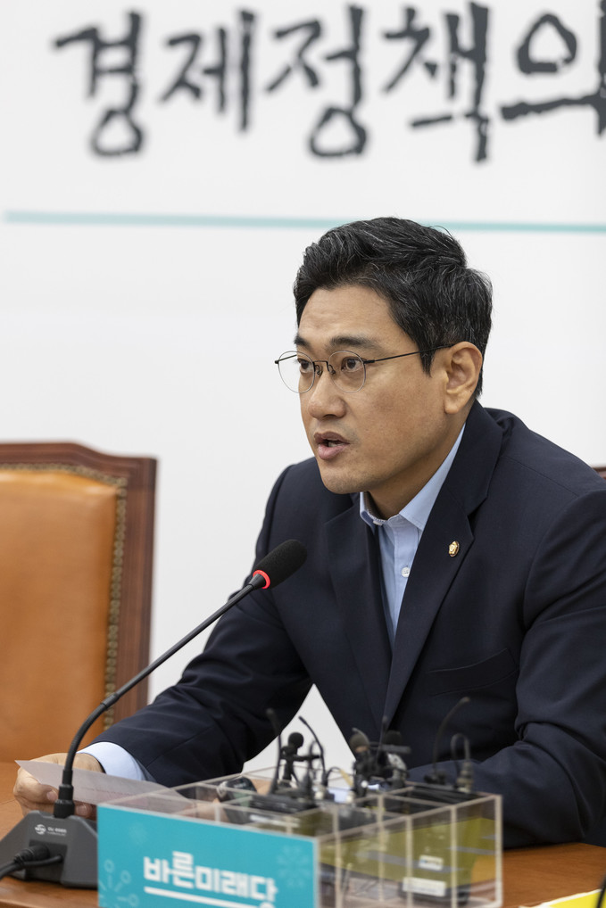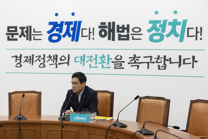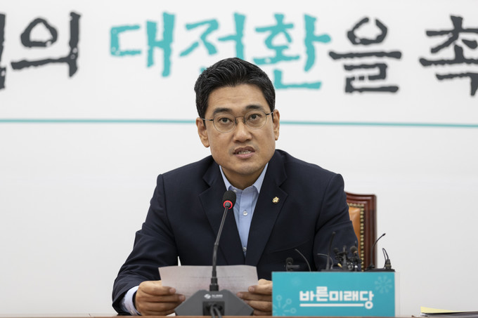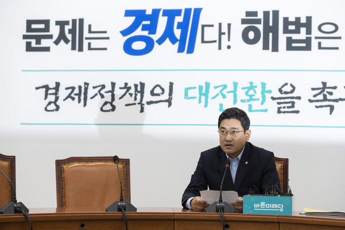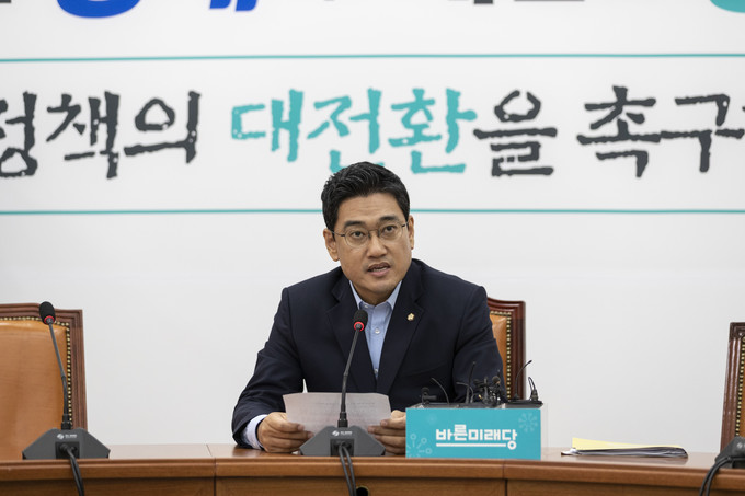 바른미래당 오신환 원내대표가 5일 오전 서울 여의도 국회에서 일본수출규제, 국회정상화 관련 기자간담회를 하고 있다.