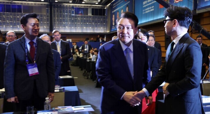 | ▲ 윤석열 대통령이 지난달 27일 서울 중구 대한상공회의소에서 열린 한 언론사 행사에서 국민의힘 한동훈 대표와 만나 악수하고 있다. [뉴시스] |
