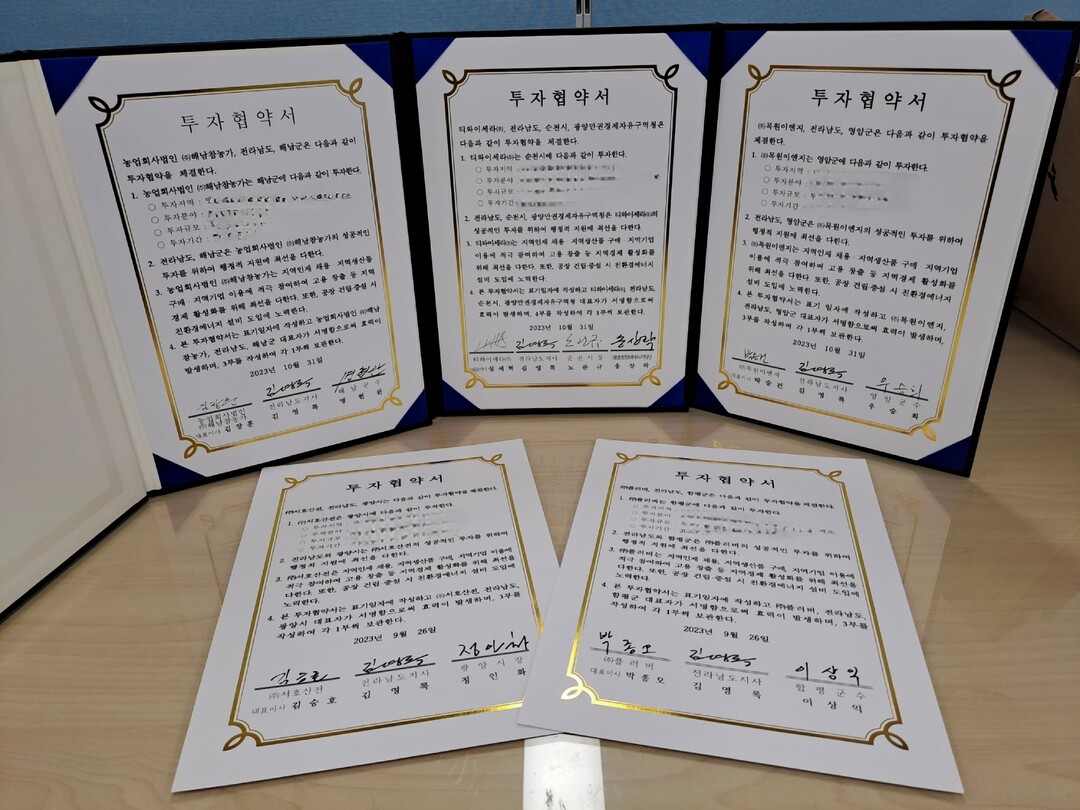 | ▲ 전라남도가 제조업 5개 기업과 423억원 규모의 투자협약을 체결한 투자협약서 [전남도 제공] |