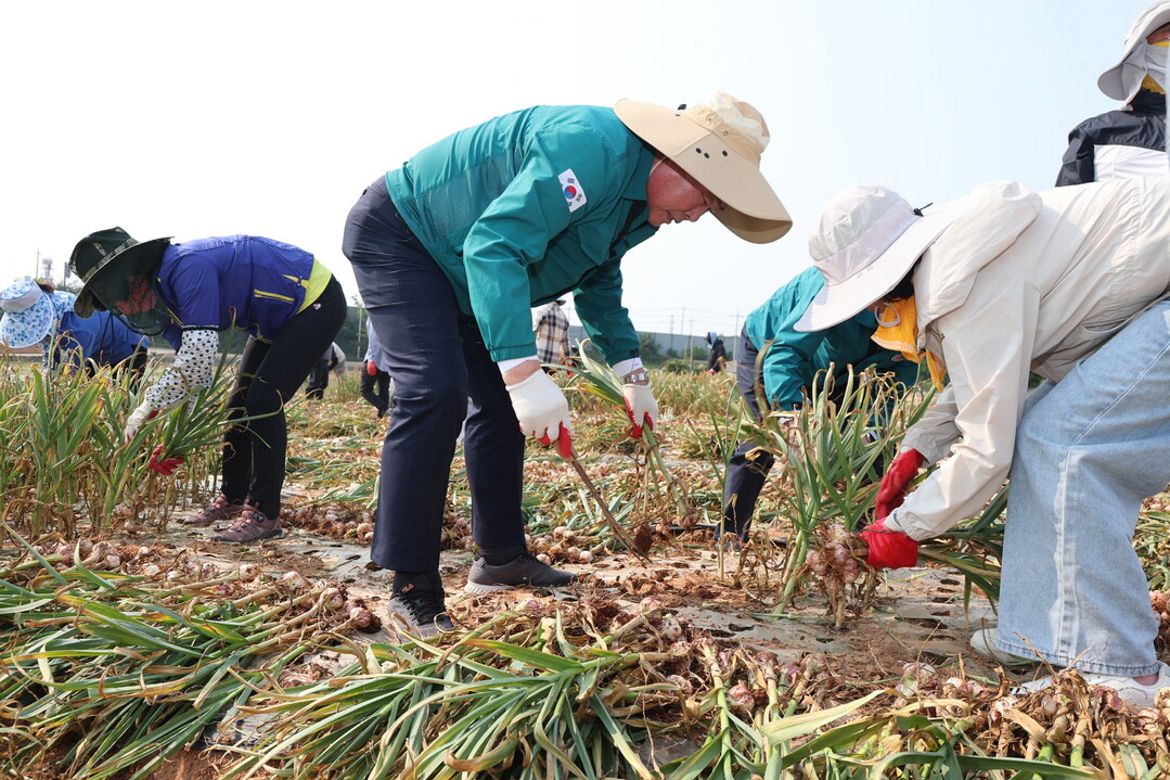 김산 전남 무안군수와 공직자들이 양파·마늘 수확기를 맞아 영농철 인력 부족으로 어려움을 겪는 농가를 돕기 위해 농촌일손돕기에 나섰다고 28일 밝혔다.