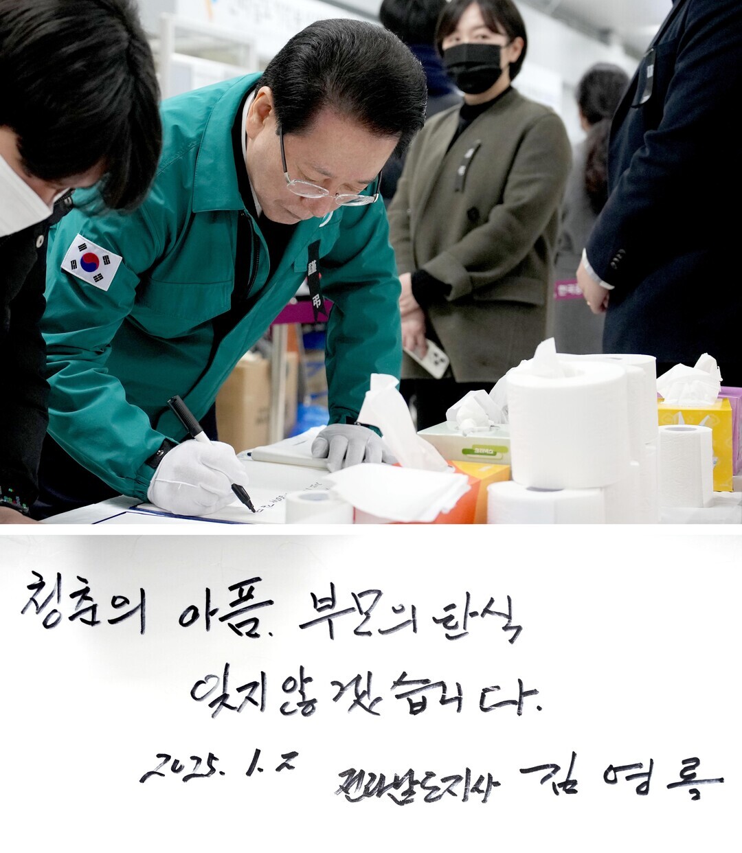 | ▲ 지난 2일 오전 김영록 전라남도지사가 제주항공 여객기 사고 희생자 무안공항 합동분향소 방명록에 "청춘의 아픔, 부모의 탄식 잊지 않겠습니다"고 작성하고 있다. [전남도 제공] |