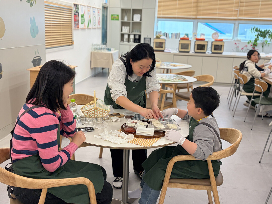 | ▲ 음성 두부공장 견학 프로그램 참가 고객들이 쿠킹 클래스에서 아이들과 두부 활용 요리를 만들어보고 있다. [풀무원 제공] |