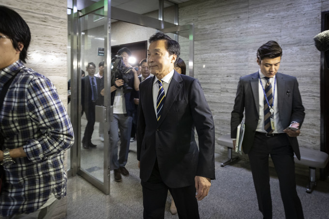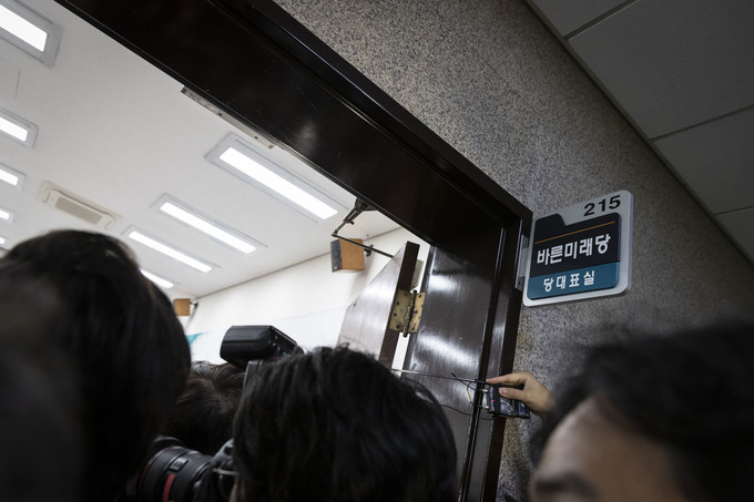 손학규 바른미래당 대표가 22일 오전 서울 여의도 국회에서 열린 최고위원회를 마치고 신임 혁신위원장 임명과 혁신안 최고위원회 상정을 촉구하며 단식 농성을 펼치고 있는 권성주 혁신위원과 대치하고 있다.