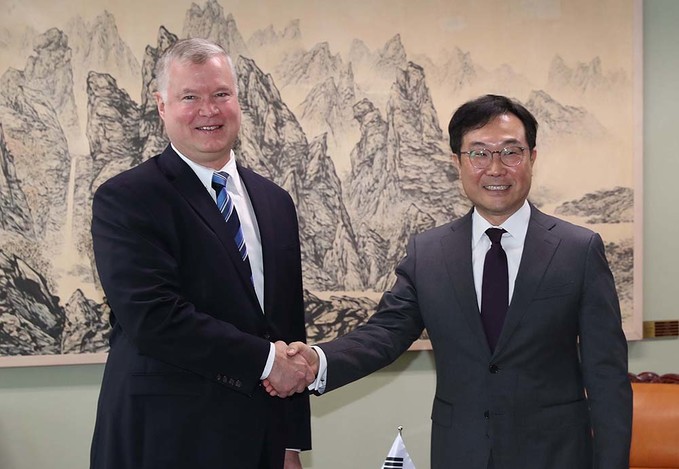 스티븐 비건 미 국무부 대북특별대표가 28일 오전 서울 도렴동 외교부 청사에서 이도훈 외교부 한반도평화교섭본부장과 만나 악수하고 있다.