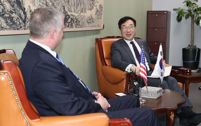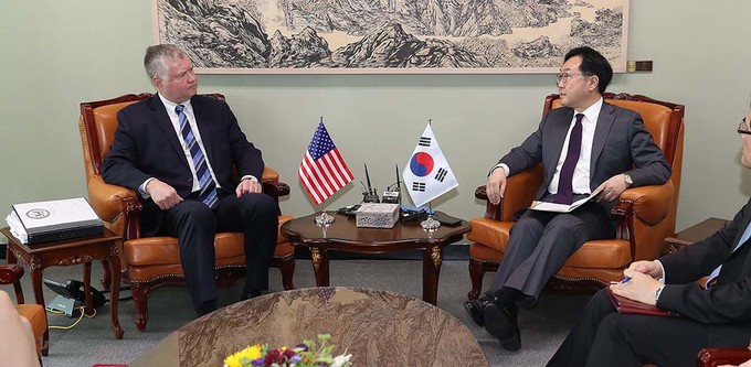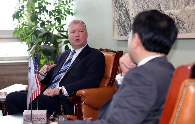 스티븐 비건 미 국무부 대북특별대표가 28일 오전 서울 도렴동 외교부 청사에서 이도훈 외교부 한반도평화교섭본부장과 만나 이야기하고 있다.