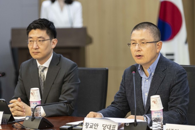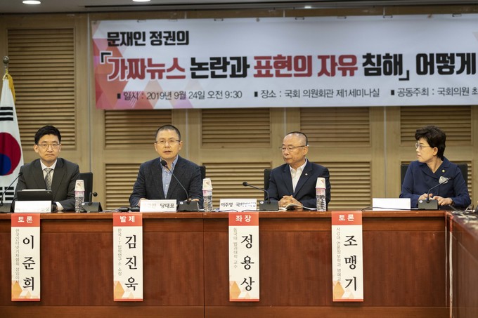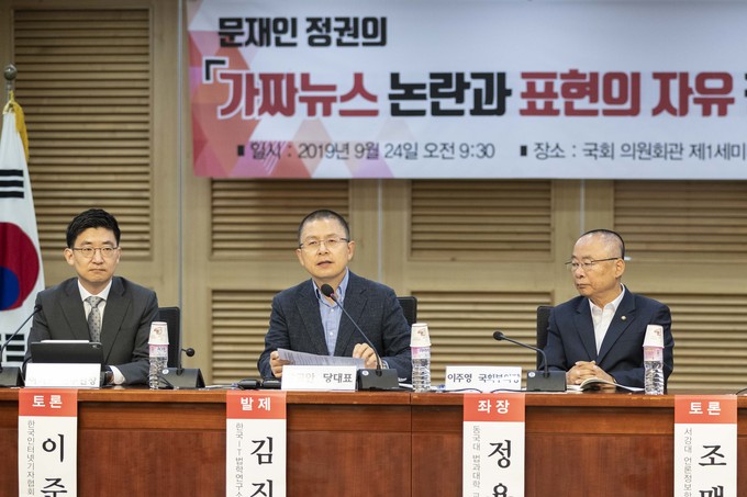 자유한국당 황교안 대표(왼쪽 두번째)가 24일 오전 서울 여의도 국회 의원회관에서 열린 '가짜뉴스 논란과 표현의 자유침해' 토론회에 참석해 인사말을 하고 있다.