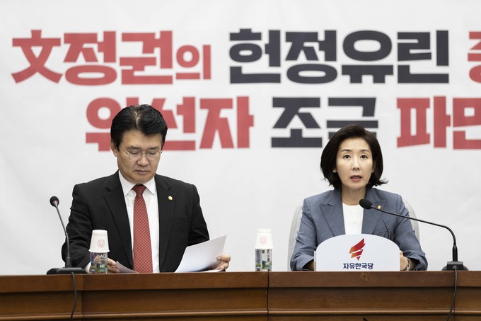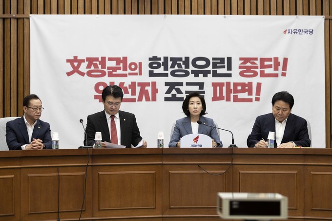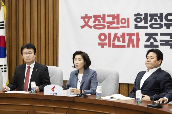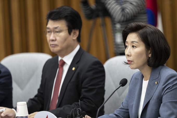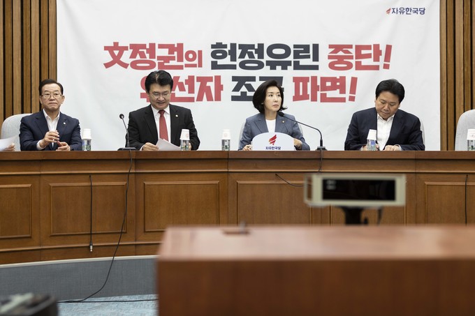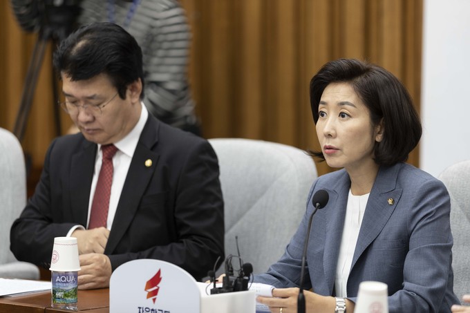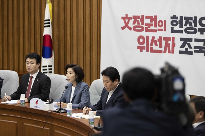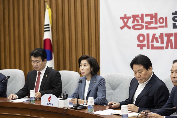 자유한국당 나경원 원내대표(왼쪽 세번째)가 27일 오전 서울 여의도 국회에서 열린 한국당 원내대책회의에 참석해 발언하고 있다.