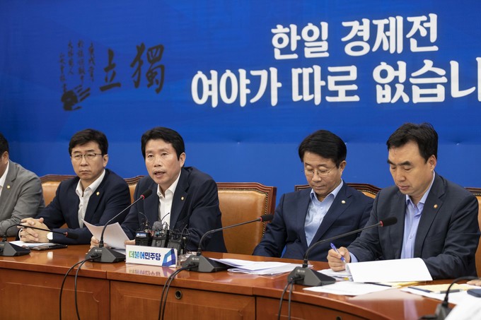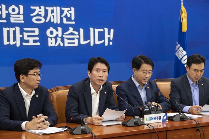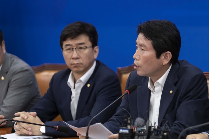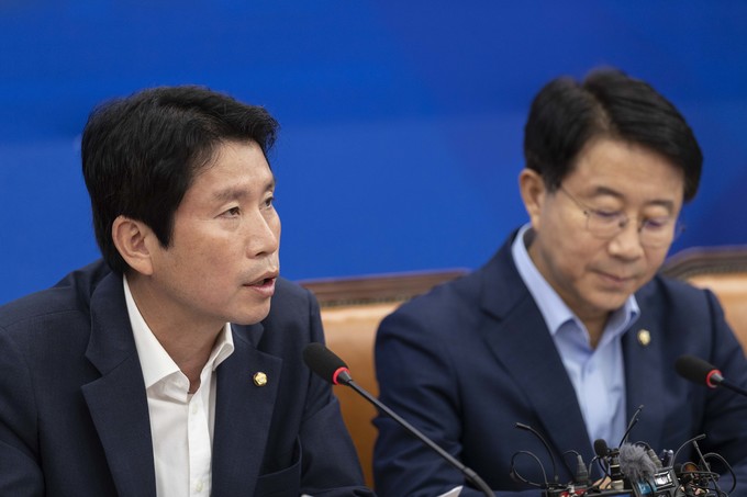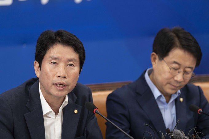 더불어민주당 이인영 원내대표(오른쪽)가 13일 오전 서울 여의도 국회에서 열린 민주당 원내대책회의-상임위간사단 연석회의에 참석해 발언하고 있다.
