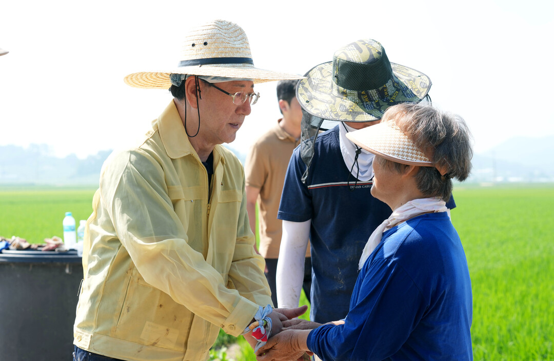 | ▲ 김영록 전라남도지사가 24일 오전 집중호우 피해를 입은 나주시 문평면 농가를 찾아 수해복구 봉사활동을 하기 전 피해 주민을 만나 위로를 건네고 있다. [전남도 제공] |
