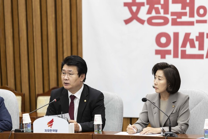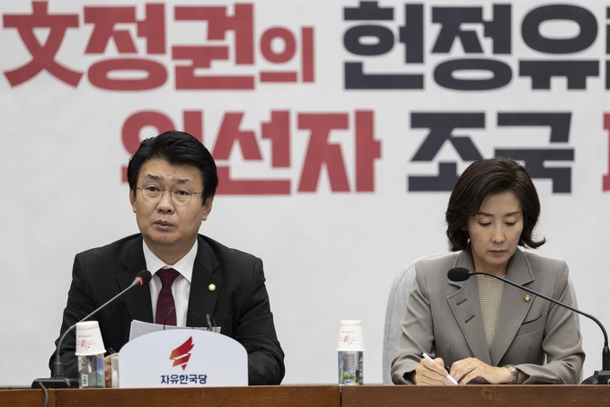 자유한국당 정용기 정책부의장(왼쪽)이 20일 오전 서울 여의도 국회에서 열린 한국당 원내대책회의에 참석해 발언하고 있다.