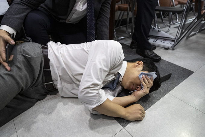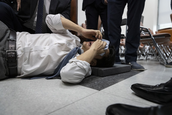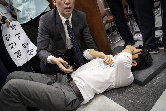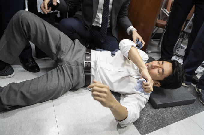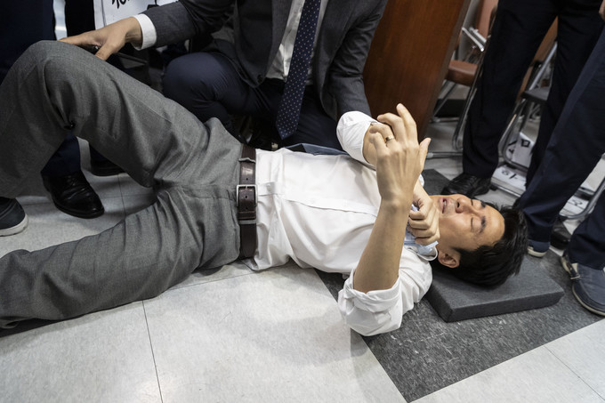 권성주 바른미래당 혁신위원장이 22일 오전 서울 여의도 국회에서 최고위원회의를 마치고 나서는 손학규 대표를 막아서다 넘어져 있다.