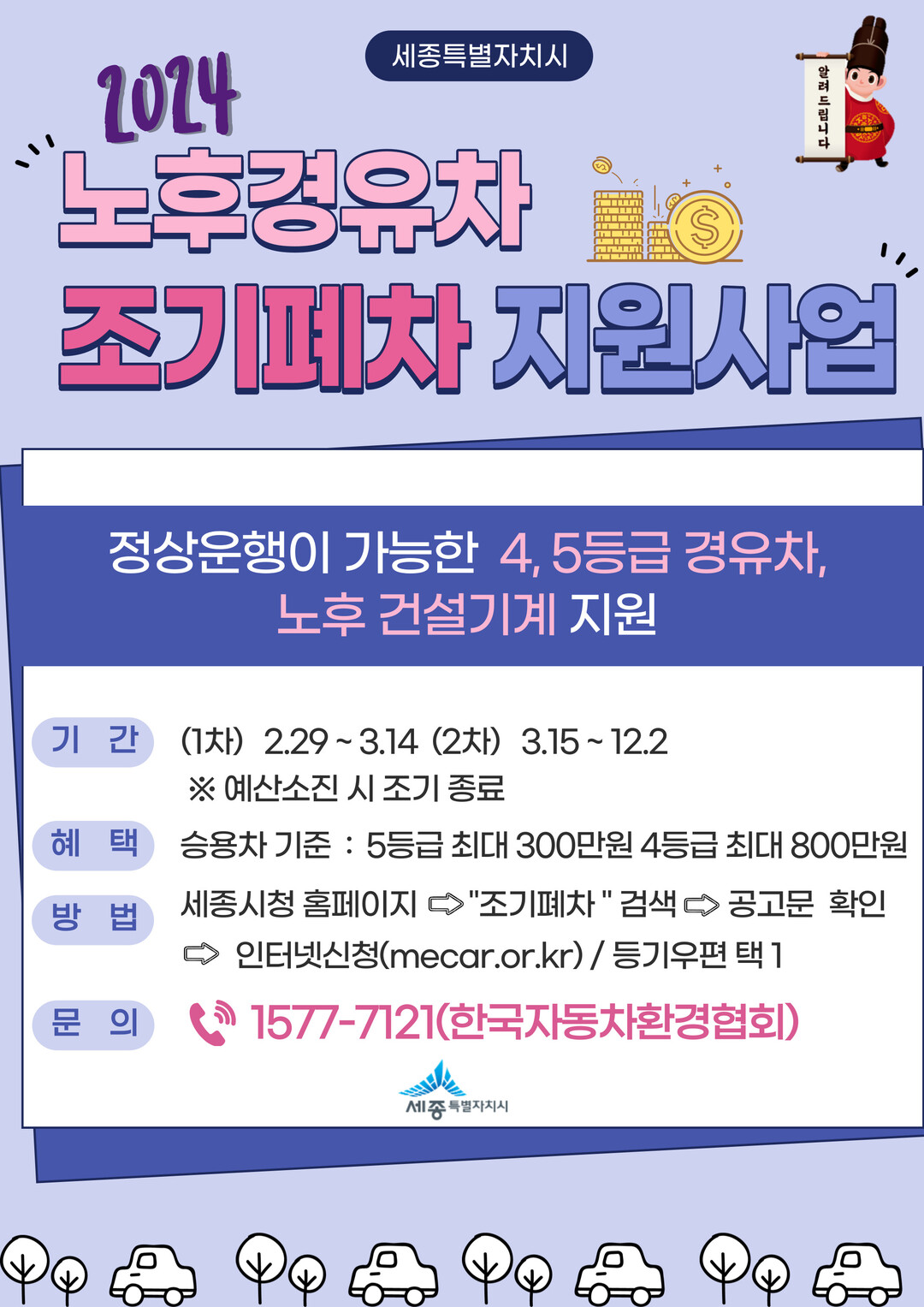 세종시가 미세먼지 저감을 위해 노후경유차 조기폐차 지원사업으로 27억 8,600만원의 예산을 세워 등급별, 중량별로 300만원부터 최대 7800만원까지 지원한다.
