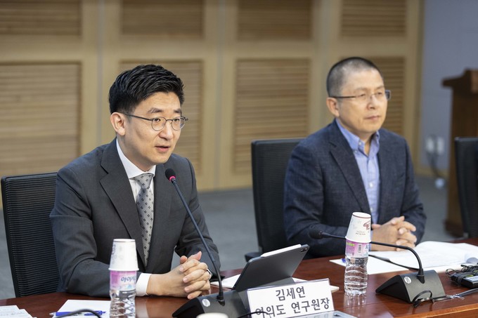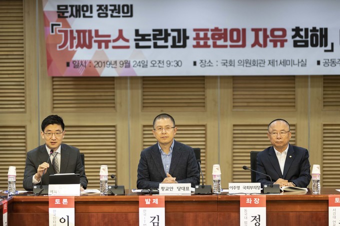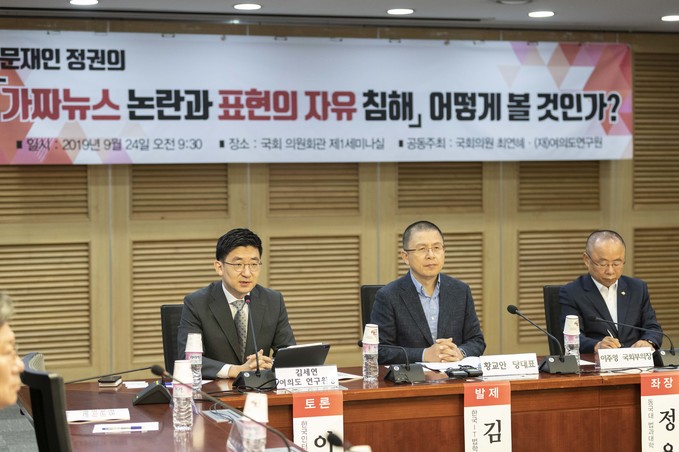 김세연 여의도 연구원장(왼쪽)이 24일 오전 서울 여의도 국회 의원회관에서 열린 '가짜뉴스 논란과 표현의 자유침해' 토론회에 참석해 발언하고 있다.