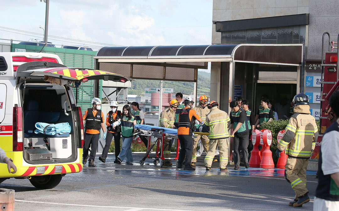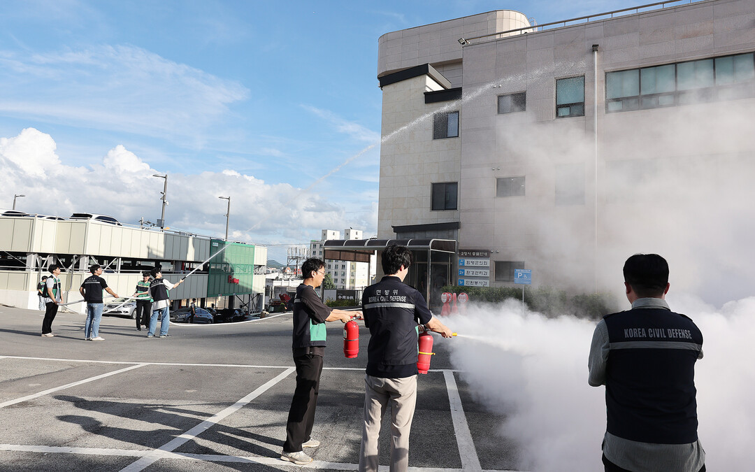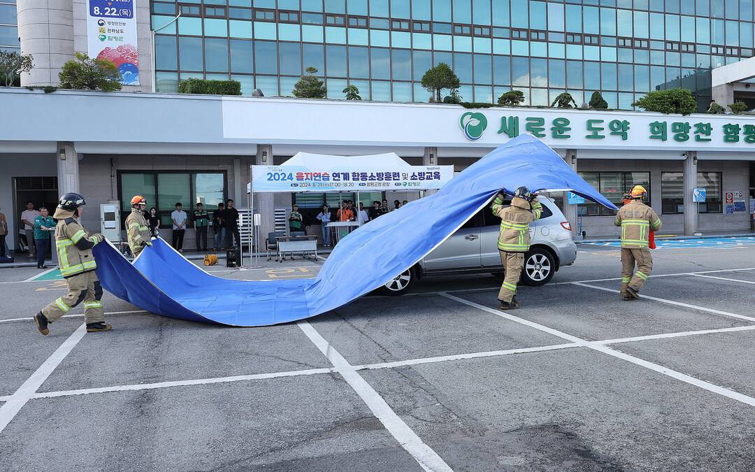 | ▲ 지난 21일 전남 함평군이, 함평소방서, 함평119안전센터, 제8332부대 3대대, 함평경찰서, 함평군자위소방대, 한국전력공사함평지사 등 100여 명이 참여한 가운데 합동 소방훈련을 실시하고 있다. 이날 훈련은 을지연습 기간을 고려해 대테러 대응훈련도 함께 실시됐다. [함평군 제공] |