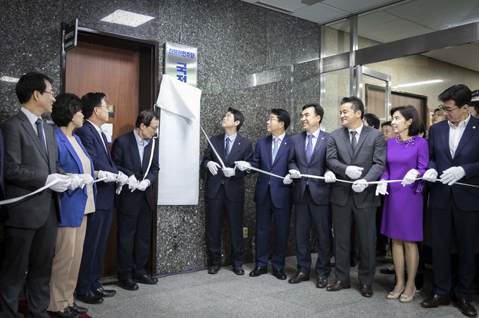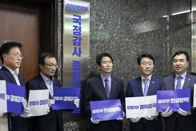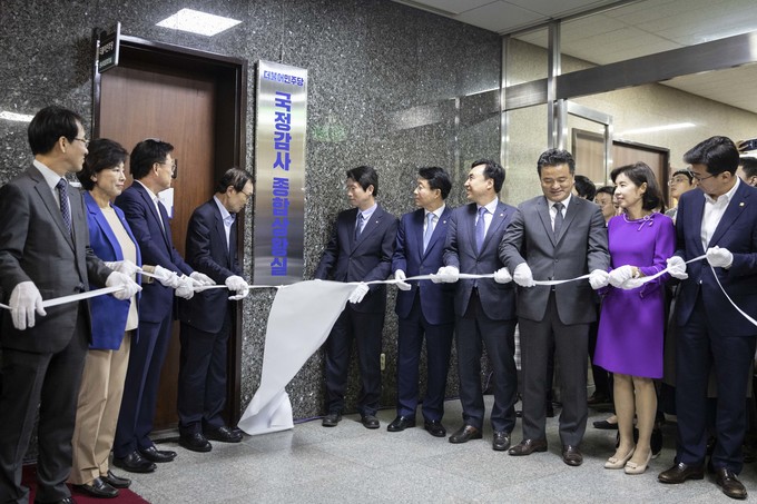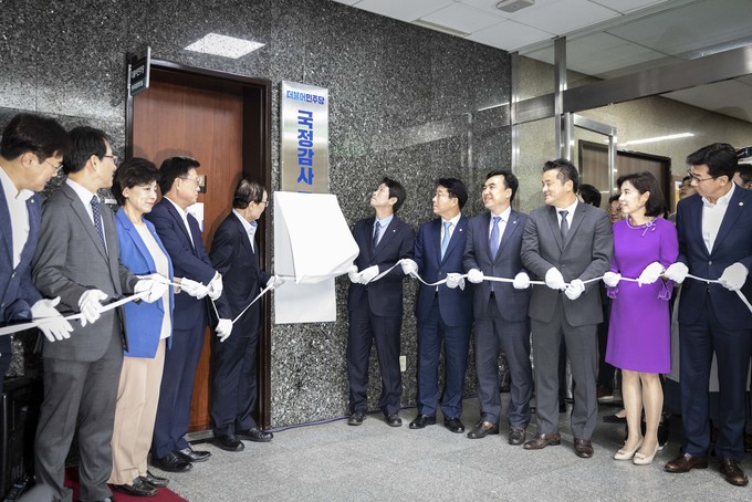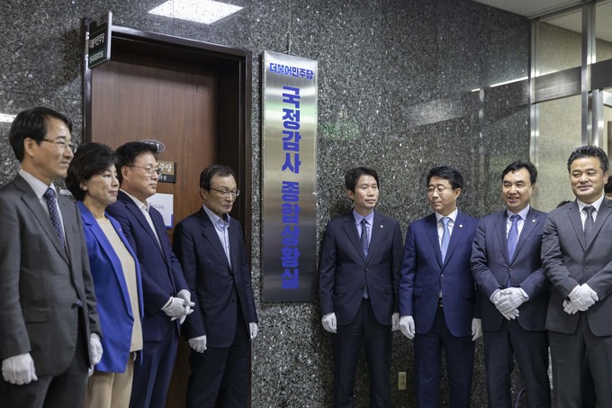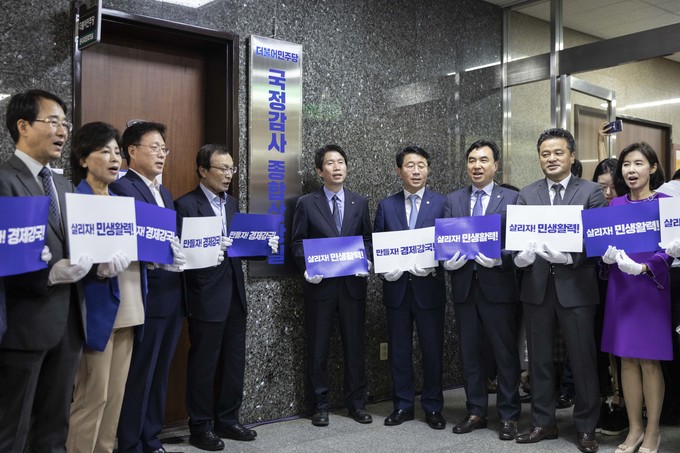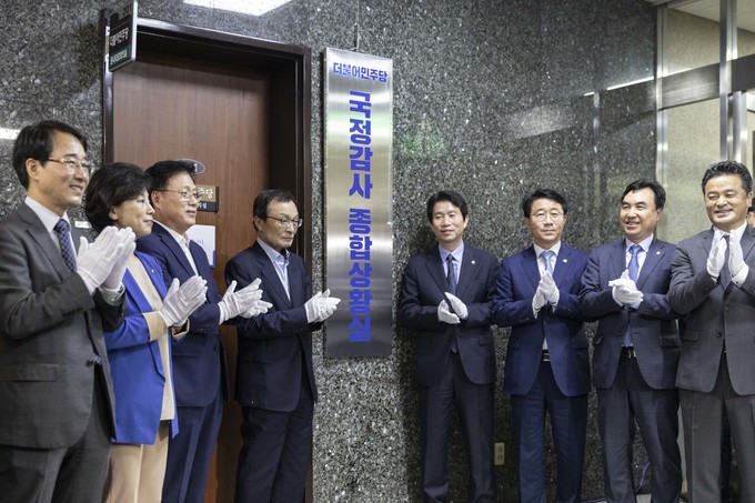 더불어민주당 이해찬 대표(왼쪽 네번째), 이인영 원내대표 등 당지도부가 30일 오전 서울 여의도 국회에서 민주당 국정감사 종합상황실 현판식을 마친 뒤 구호를 외치고 있다.