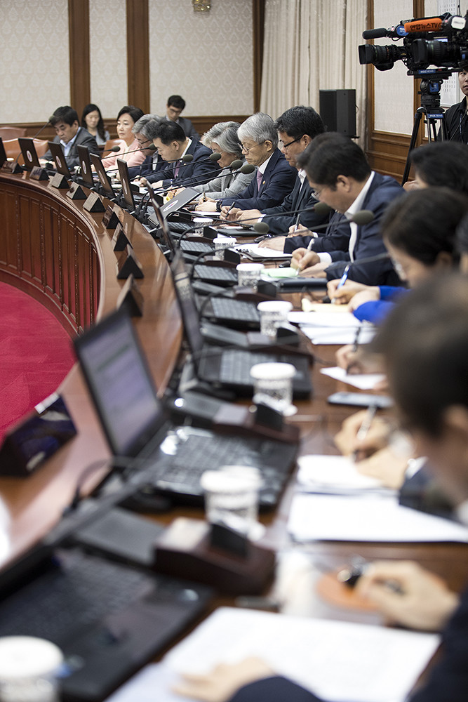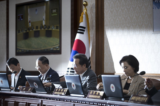 17일 오전 서울 종로구 정부서울청사에서 열린 국무회의에서 국무위원들이 이낙연 국무총리의 모두발언을 받아적고 있다.