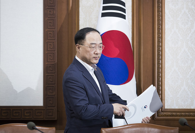 홍남기 경제부총리 겸 기획재정부 장관이 17일 오전 서울 종로구 정부서울청사에서 열린 국무회의를 위해 회의실로 들어오고 있다.