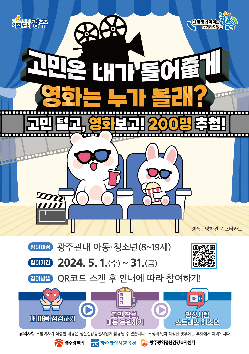 이번 캠페인은 광주광역정신건강복지센터와 함께 '고민은 내가 들어줄게, 영화는 누가 볼래'라는 주제로 '내 마음 점검하기'와 '고민 작성·마음 응원하기', '스트레스 해소 영상 시청'으로 이뤄진다.