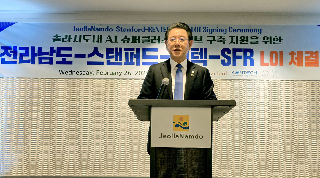 | ▲ 미국을 순방 중인 김영록 전남도지사가 26일(현지 시간) 샌프란시스코의 하얏트 호텔에서 열린 솔라시도 AI 슈퍼클러스터 구축지원을 위한 '전남도-스탠퍼드대-켄택-SFR LOI' 행사에서 인사말을 하고 있다. [전남도 제공] |