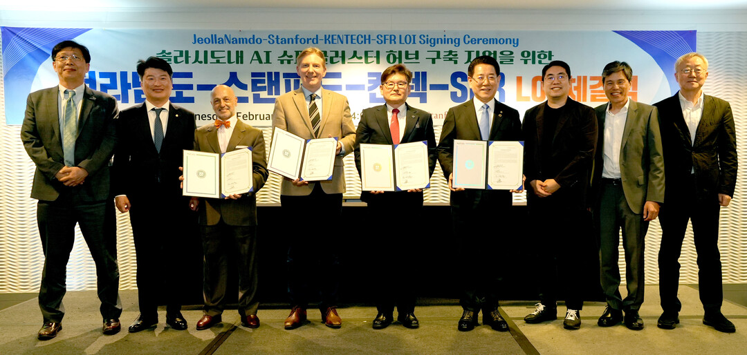| ▲ 미국을 순방 중인 김영록 전남도지사가 26일(현지 시간) 샌프란시스코의 하얏트 호텔에서 세계 최대 3GW 규모의 '솔라시도 Al 슈퍼클러스터 허브' 구축 성공을 지원하기 위해 스탠퍼드센터, 한국에너지공과대학교, 스톡 팜 로드(SFR·Stock Farm Road)와 의향서(LOI)에 서명하고 기념촬영을 하고 있다. [전남도 제공] |