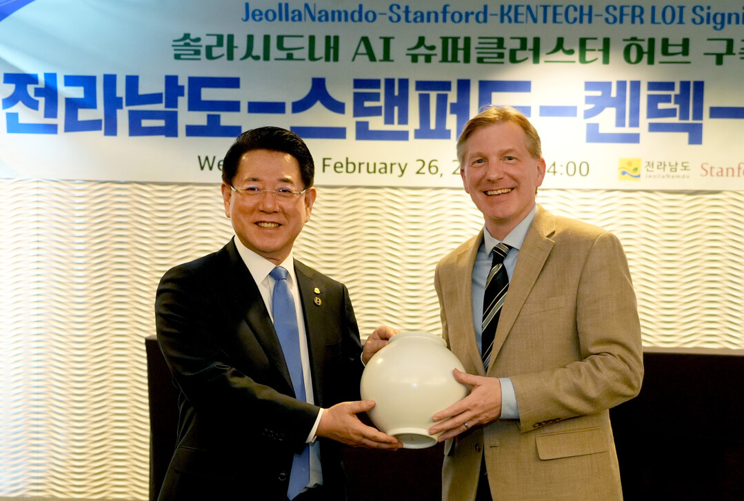 | ▲ 미국을 순방 중인 김영록 전남도지사가 26일(현지 시간) 샌프란시스코의 하얏트 호텔에서 열린 솔라시도 AI 슈퍼클러스터 구축지원을 위한 '전남도-스탠퍼드대-켄택-SFR LOI' 행사에서 마이클 레펙 스탠퍼드대 교수에게 기념품을 전달하고 있다. [전남도 제공] |