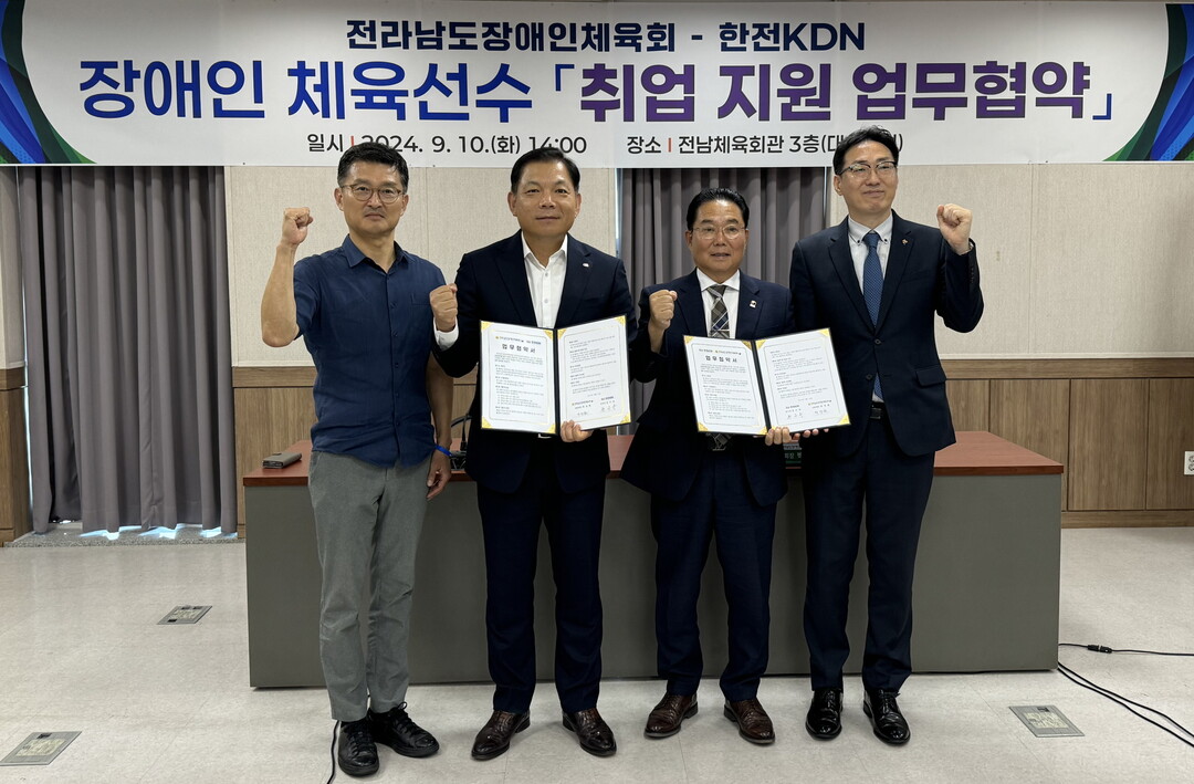 | ▲ 지난 9월 10일 한전KDN 정수옥 기획관리본부장(오른쪽)과 전라남도장애인체육회 박정현 상임부회장이 장애인 체육선수 '취업지원 업무협약'을 체결한 뒤 기념촬영을 하고 있다. [한전KDN 제공] |