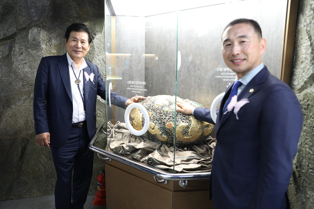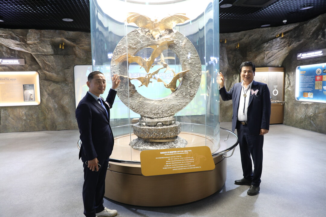 | ▲ 이상익(왼쪽) 함평군수가 25일 오전에 열린 제27회 함평나비대축제 개장식에서 이남오 함평군의회 의장과 함께 황금박쥐상 앞에서 기념촬영을 하고 있다. [강성명 기자] |