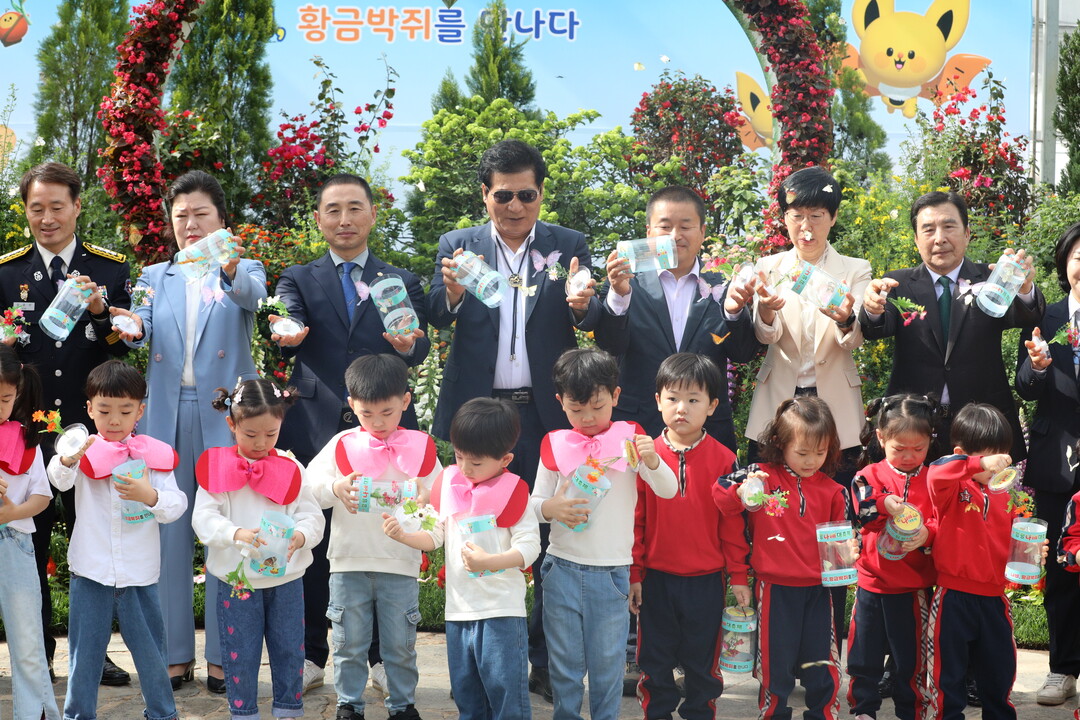 | ▲ 이상익 전남 함평군수가 25일 오전에 열린 제27회 함평나비대축제 개장식에서 함평 어린이집 아이들과 함께 나비날리기 행사를 하고 있다. [강성명 기자] |