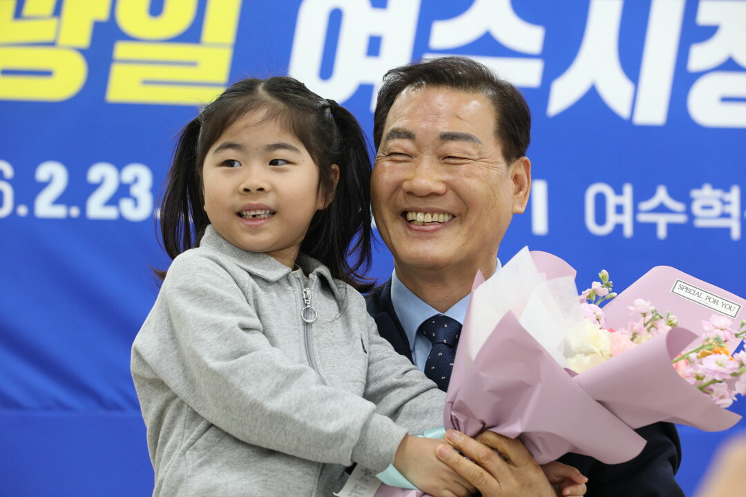 | ▲ 이광일 전남도의회 부의장이 지난 23일 여수혁신지원센터에서 여수시장 출마 기자회견에 앞서 지지자 자녀에게 꽃다발을 받고 있다. [강성명 기자] |