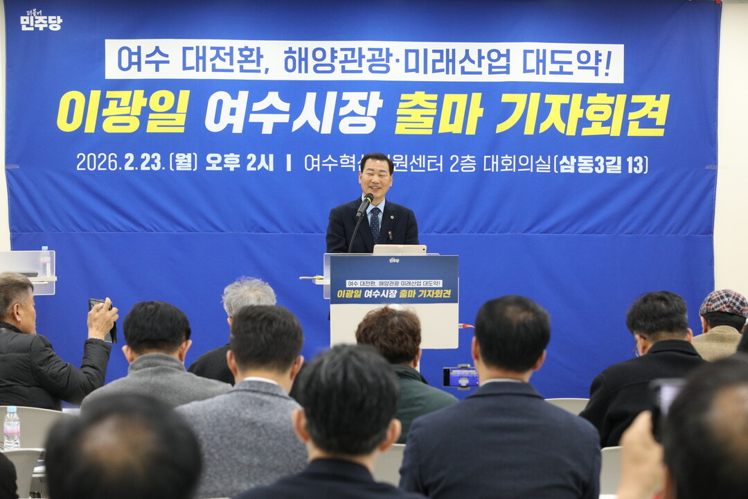 | ▲ 이광일 전남도의회 부의장이 지난 23일 여수혁신지원센터에서 여수시장 출마 기자회견을 갖고 기자 질문에 일문일답을 하고 있다. [강성명 기자] |
