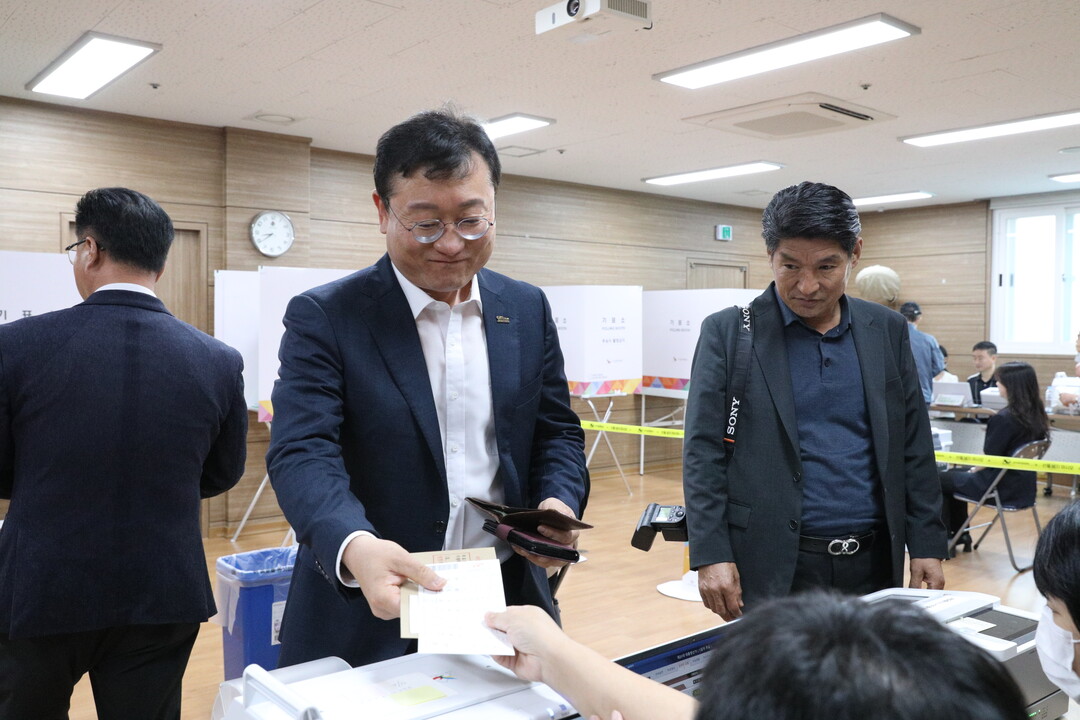 | ▲ 명창환 전남도 행정부지사가 제21대 대통령선거 사전투표 첫날인 29일 아침 9시쯤 목포시 신흥동 사전투표소에서 투표용지를 받고 있다. [강성명 기자] |