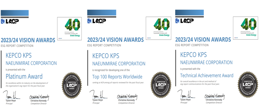 한전KPS의 지속가능경영보고서는 'Green Energy와 함께, 사랑받는 지속성장 기업'이라는 ESG 비전 아래 회사의 ESG 경영 추진 노력을 일관되고 이해하기 쉽게 서술했다는 평가를 받으며, 전체 8개 평가 항목 가운데 7개에서 만점을 받으면서 총점 99점(100점 만점)으로 전력 유틸리티 분야 ESG 보고서 부문 최고 등급인 대상을 수상했다.