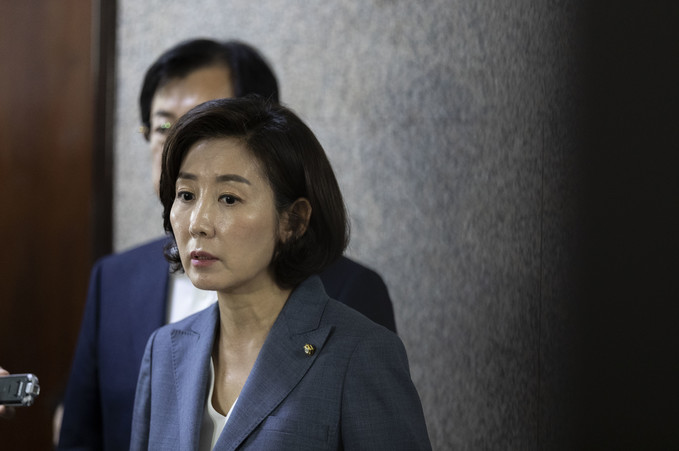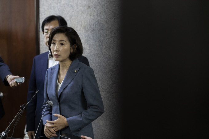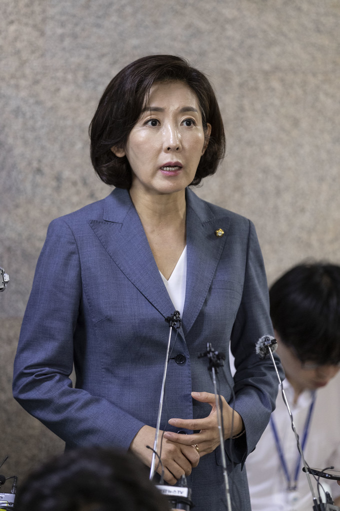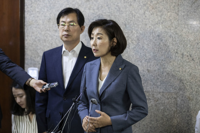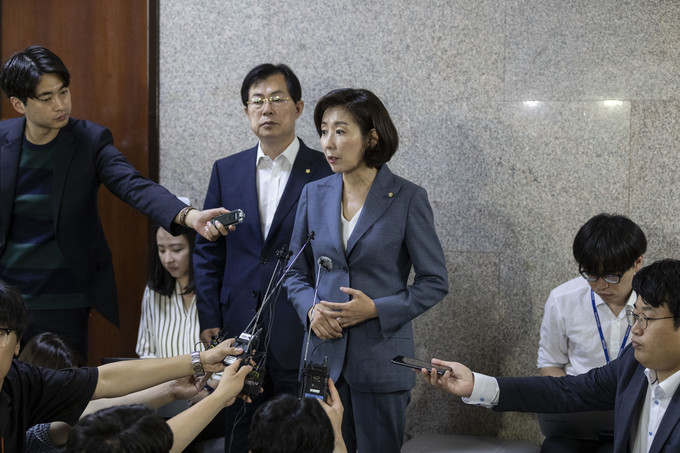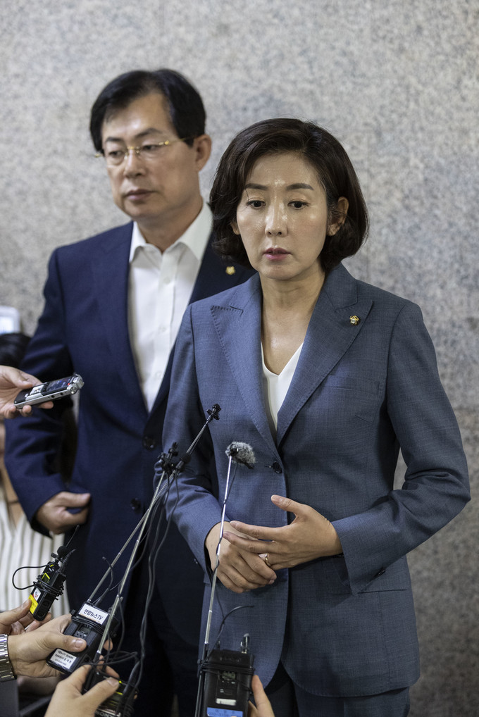 자유한국당 나경원 원내대표가 24일 오전 서울 여의도 국회에서 열린 원내대표 중진의원 연석회의를 마치고 취재진 질문에 답하고 있다.