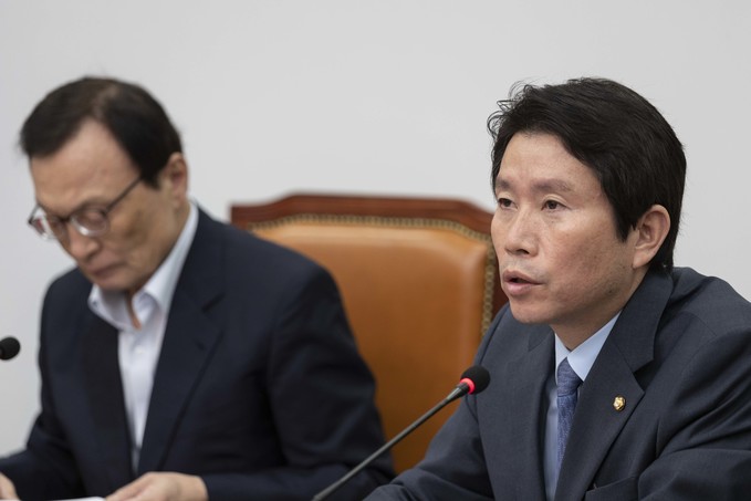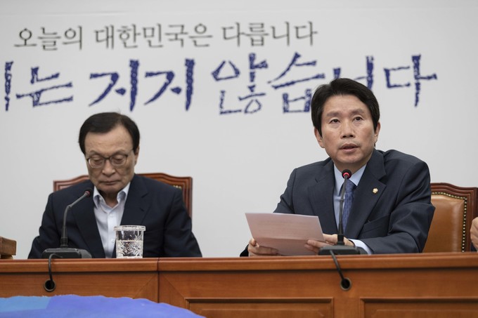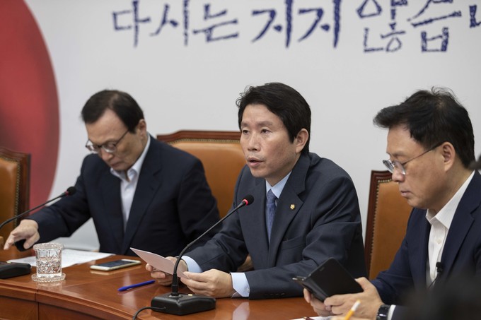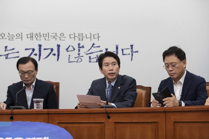 더불어민주당 이인영 원내대표(가운데)가 27일 오전 서울 여의도 국회에서 열린 민주당 최고위원회의에 참석해 발언하고 있다.