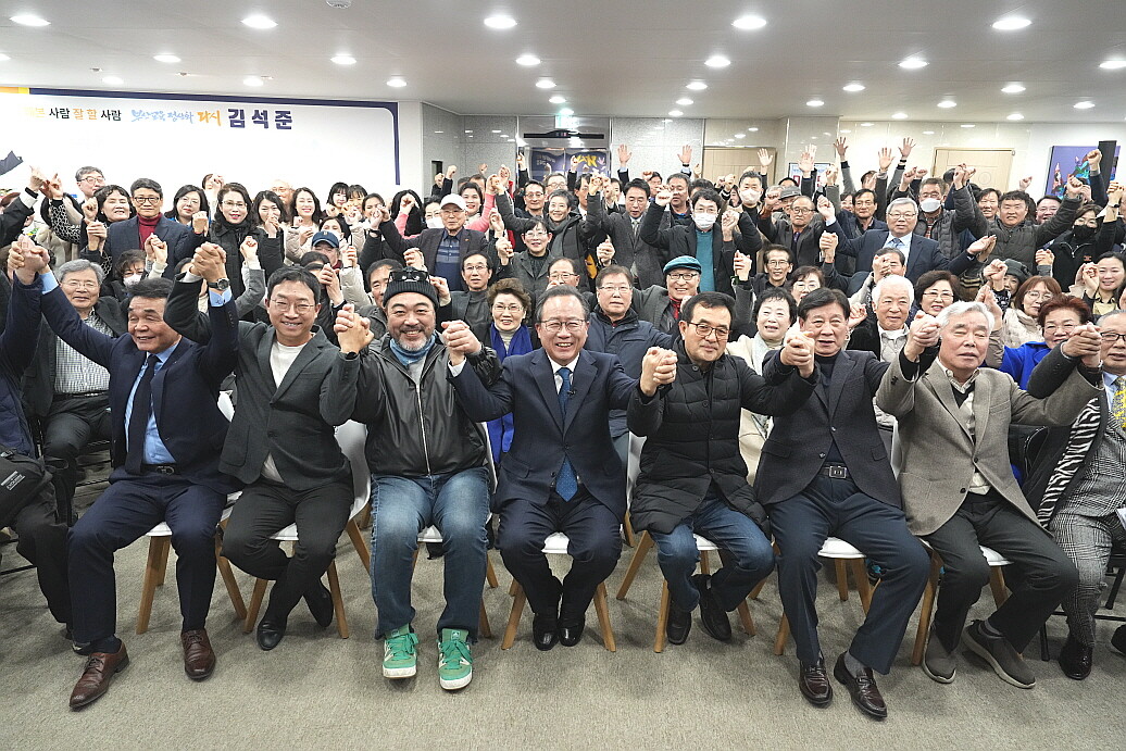 | ▲ 김석준 예비후보가 8일 선거사무소 개소식에서 지지자들과 기념촬영을 하고 있다. [김석준 선거캠프 제공] |