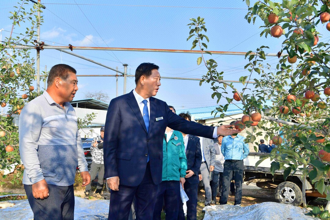 | ▲ 12일 김한종 장성군수가 삼서사과작목반을 찾아 기후 변화로 어려움을 겪고 있는 농업인들을 위로하고 있다.[장성군 제공] |