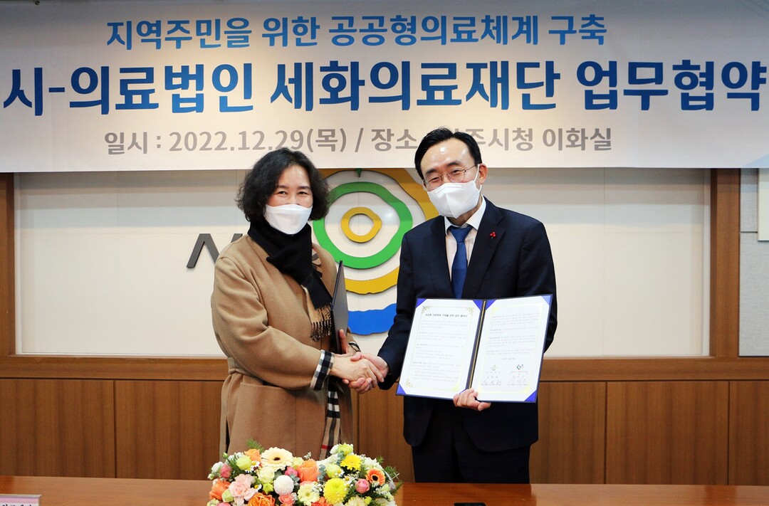 | ▲ 지난해 12월 윤병태 나주시장과 김미순 의료법인 세화의료재단 이사장이 '공공형 의료체계 구축을 위한 업무협약식'을 체결한 뒤 기념촬영을 하고 있다. [나주시 제공] |