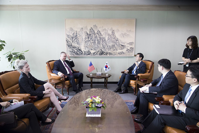 스티븐 비건 미 국무부 대북정책특별대표가 21일 오전 서울 종로구 외교부 청사에서 열린 한미 북핵 수석대표 협의에서 인사말을 하고 있다.