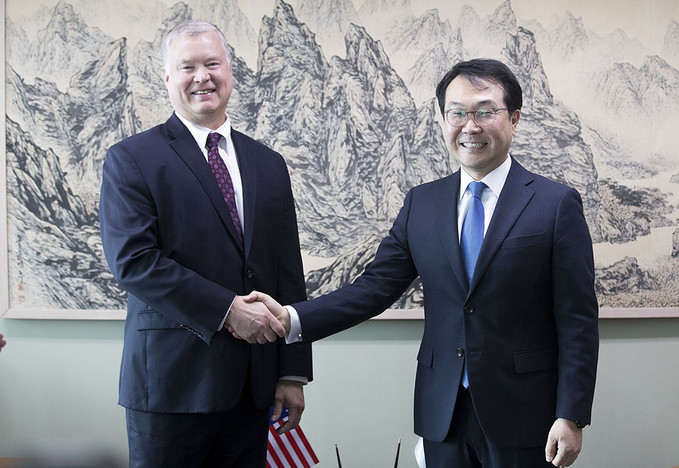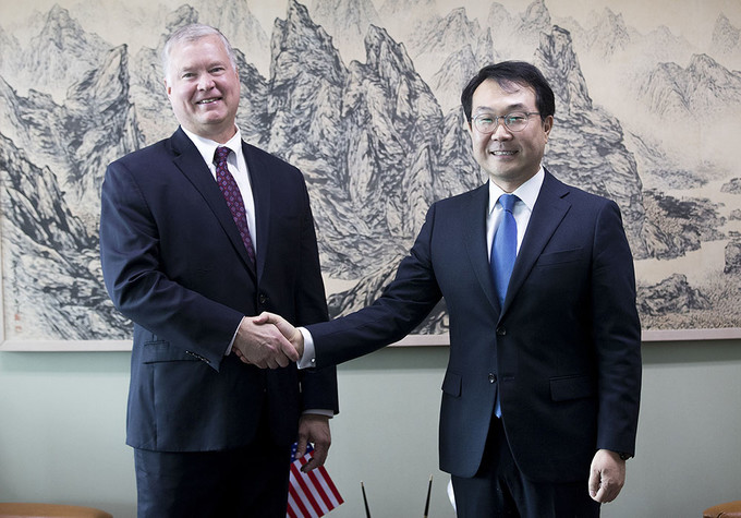 이도훈 외교부 한반도평화교섭본부장(오른쪽)이 21일 오전 서울 종로구 외교부 청사에서 열린 한미 북핵 수석대표 협의 전 스티븐 비건 미 국무부 대북정책특별대표와 악수를 하고 있다.