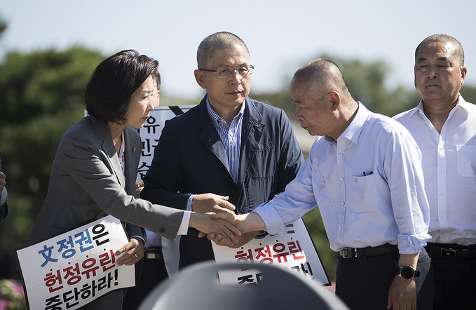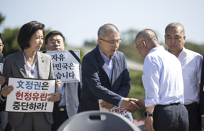이주영 국회부의장이 18일 오전 서울 종로구 청와대 분수대 앞에서 열린 최고위원-중진의원 연석회의에서 삭발식을 마친 뒤 나경원 자유한국당 원내대표와 악수를 하고 있다.