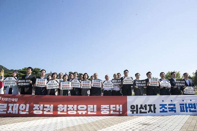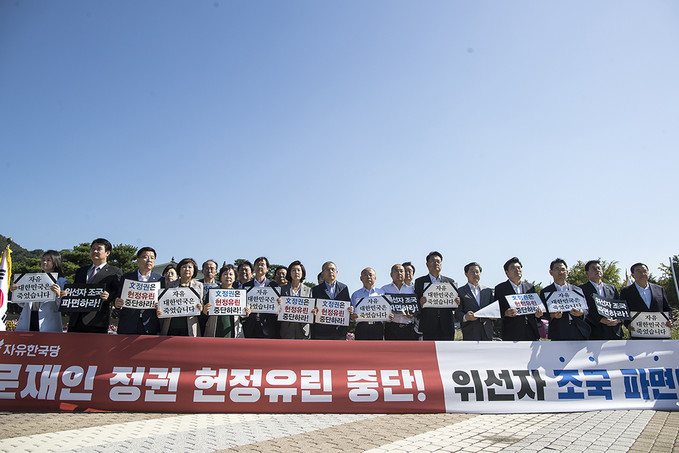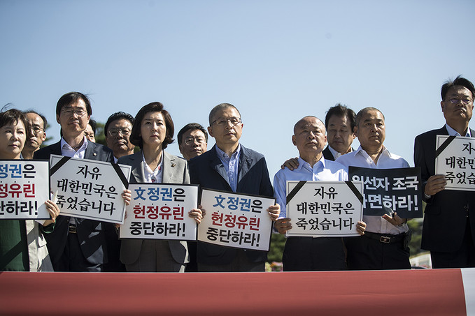 18일 오전 서울 종로구 청와대 분수대 앞에서 열린 최고위원-중진의원 연석회의에서 황교안 자유한국당 대표와 당 지도부들이 피켓을 들고 구호를 외치고 있다.