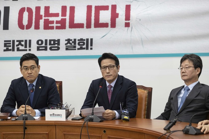 바른미래당 정병국 의원(왼쪽 네번째)이 27일 오전 서울 여의도 국회에서 열린 바른미래당 긴급의원총회에 참석해 발언하고 있다.
